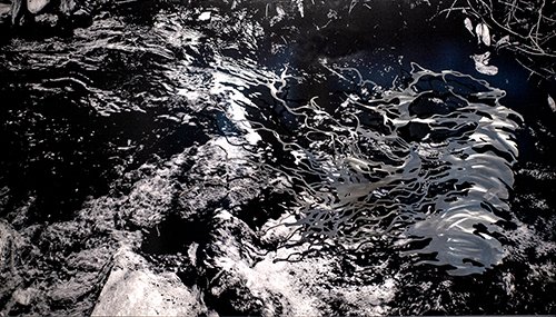 Ces traces du flux, après découpe, forment des sortes de dentelles d’eau. Elles sont ensuite superposées aux images qui les ont initiées. Les différents plans jouent ainsi entre profondeur, lumière et mouvement.